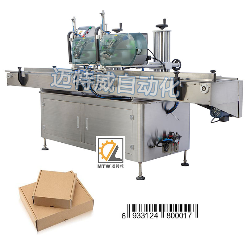 該設備用于瓶子、盒子、成型包、包裝箱等上平面的打印和貼標,可貼一張或兩張標??稍诳瞻讟嘶蝾A留標上在線即時打印生產(chǎn)日期批號、序列號、條形碼、二維碼、品名、專銷區(qū)等預設內(nèi)容并完成同步貼標。