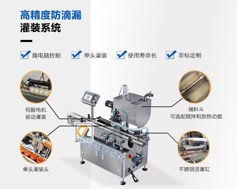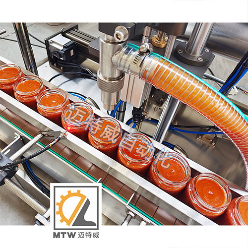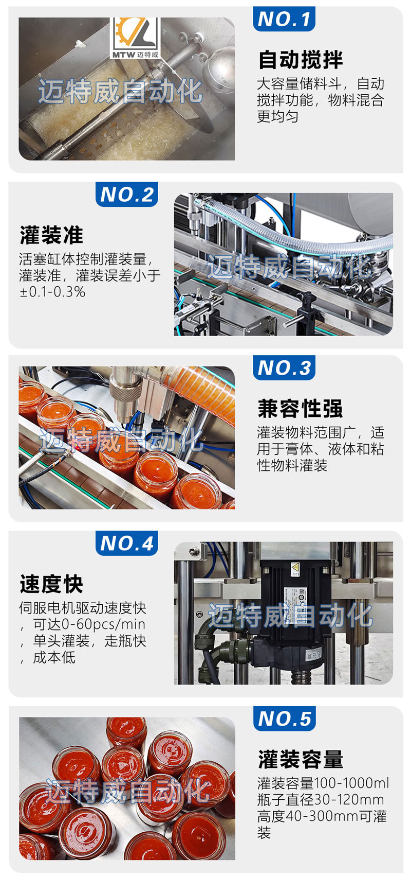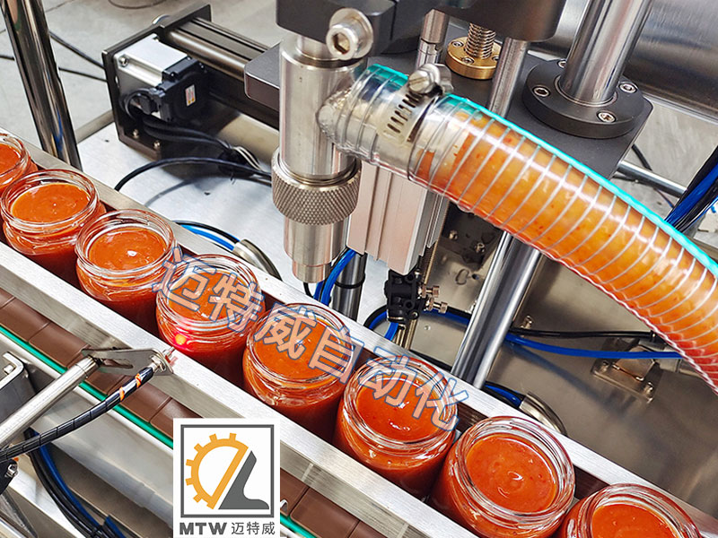 單頭伺服灌裝機采用伺服活塞定量灌裝,單頭灌裝,設(shè)備投入少,走瓶速度快,效率高,灌裝容量100-1000ml,適用于醬料、膏體、液體和粘性物料灌裝。
