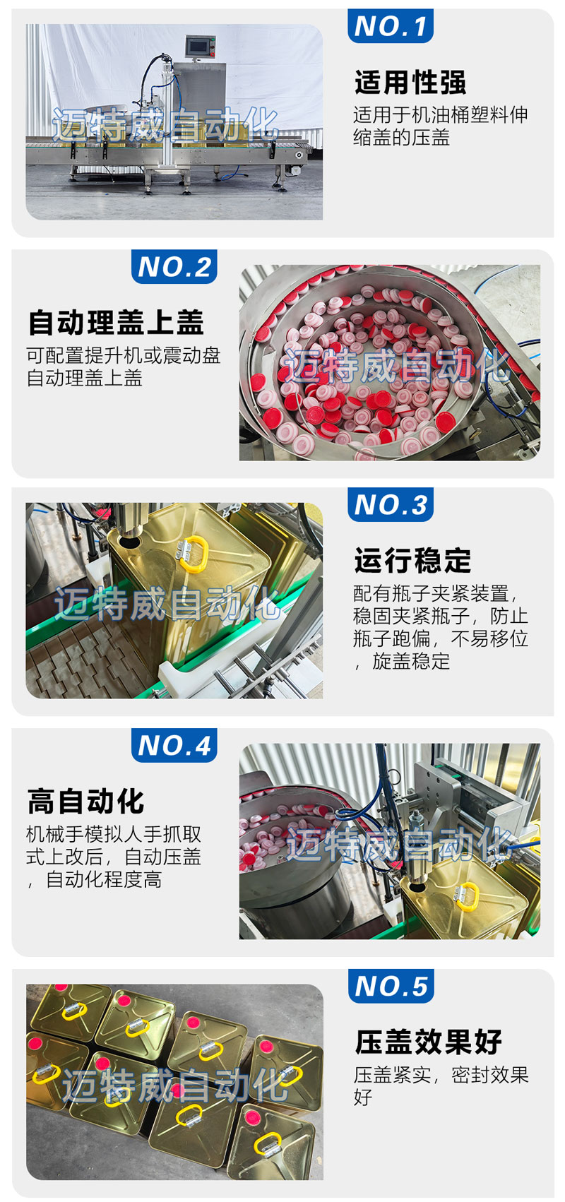 此款壓蓋機適用于機油桶塑料伸縮蓋的壓蓋。使用振動盤將瓶蓋送入瓶口,然后按下瓶蓋,將瓶蓋和瓶子緊緊密封。
