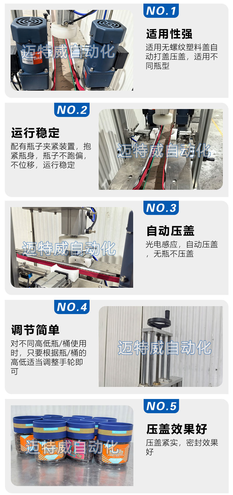 本機(jī)適用于各種無(wú)螺紋塑料蓋自動(dòng)打蓋壓蓋,使用范圍廣、點(diǎn)地面積小,與灌裝機(jī)、上蓋機(jī)、裝箱機(jī)等聯(lián)機(jī)使用,完成后道包裝生產(chǎn)線。