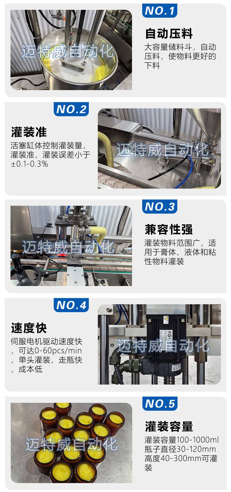 單頭伺服灌裝機(jī)采用伺服活塞定量灌裝,單頭灌裝,設(shè)備投入少,走瓶速度快,效率高,灌裝容量100-1000ml,適用于醬料、膏體、液體和粘性物料灌裝。