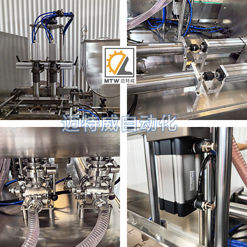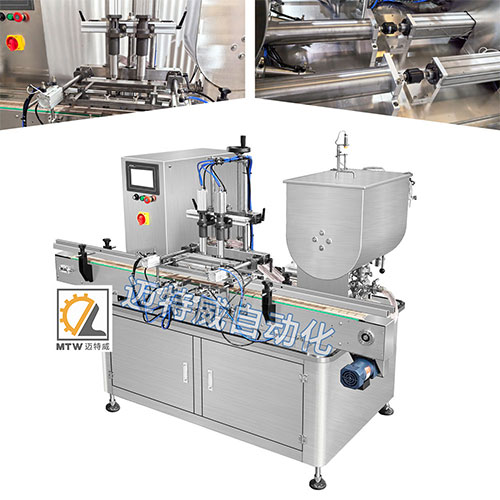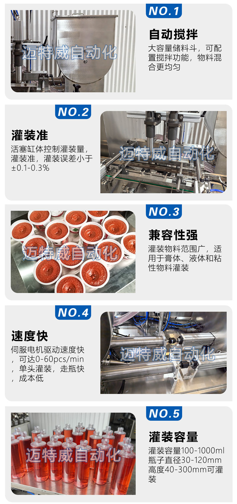 雙頭伺服灌裝機(jī)采用伺服活塞定量灌裝,單頭灌裝,設(shè)備投入少,走瓶速度快,效率高,灌裝容量100-1000ml,適用于醬料、膏體、液體和粘性物料灌裝。