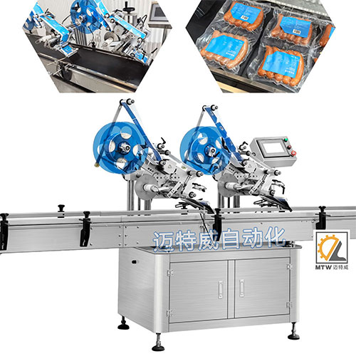 這款平面貼標(biāo)機(jī)是針對(duì)這種兩聯(lián)包火腿腸包裝定制的,平面貼標(biāo),精度更高。