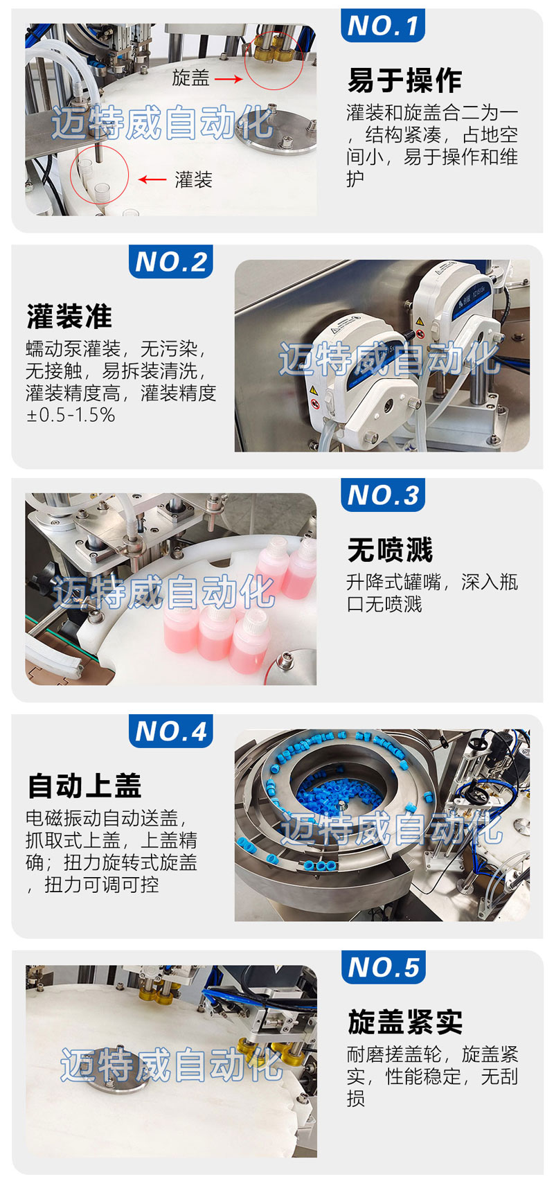 ● 采用高精度蠕動(dòng)泵定量灌裝,電磁振動(dòng)自動(dòng)送蓋,伺服驅(qū)動(dòng)旋蓋,具有無(wú)瓶不灌裝的功能;