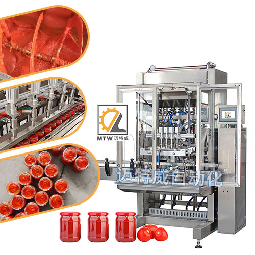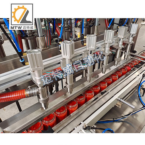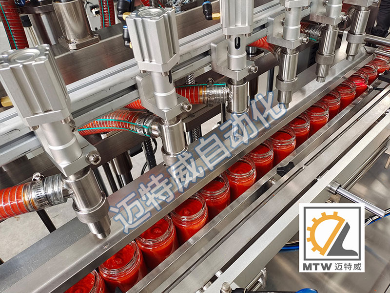 醬料灌裝機采用伺服活塞灌裝機灌裝,活塞缸體控制灌裝量,灌裝準(zhǔn),誤差小,灌裝量可在100-1000、200-2000、500-5000ml范圍內(nèi)任意選擇調(diào)整,適用于不同瓶型的醬料在線自動灌裝。